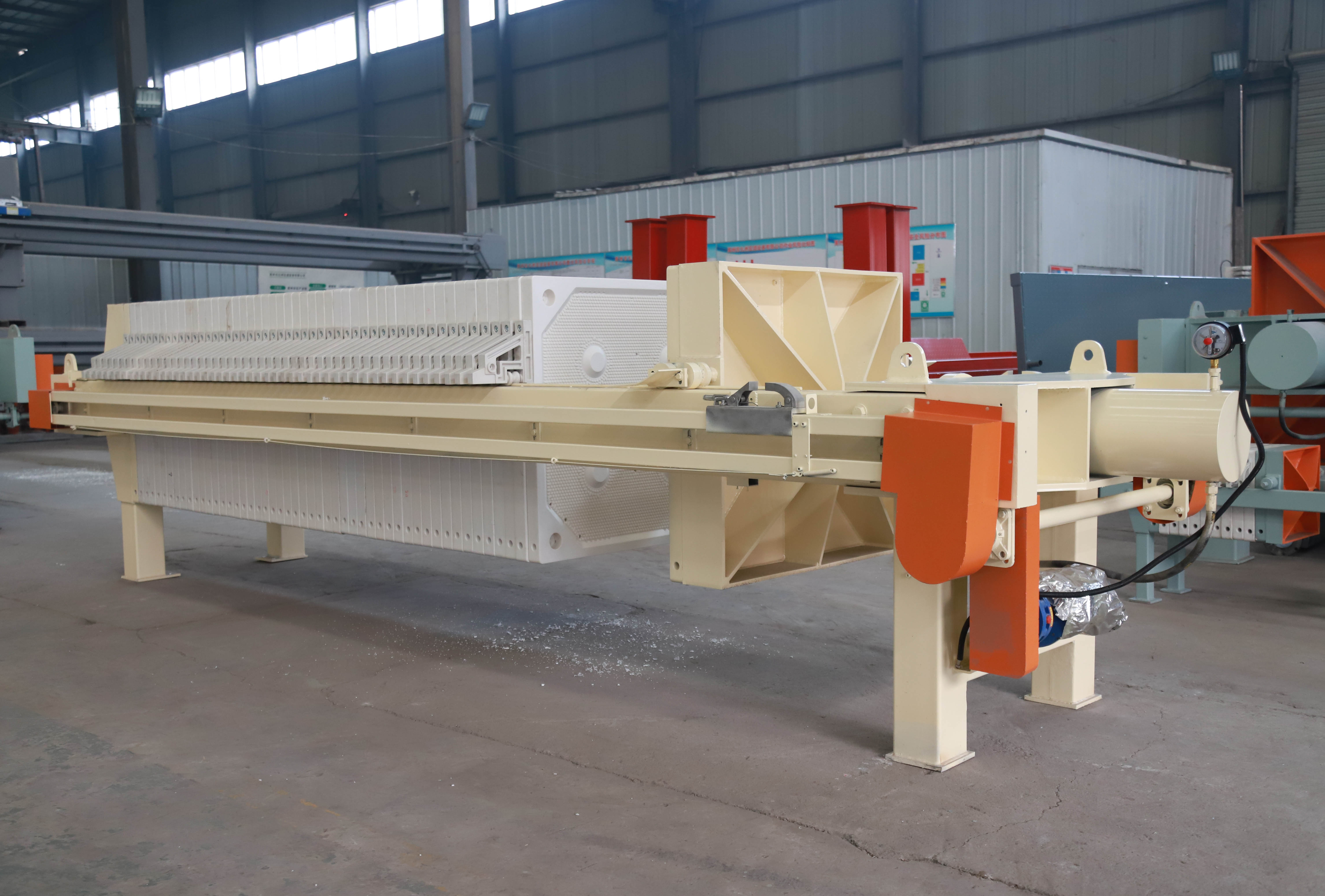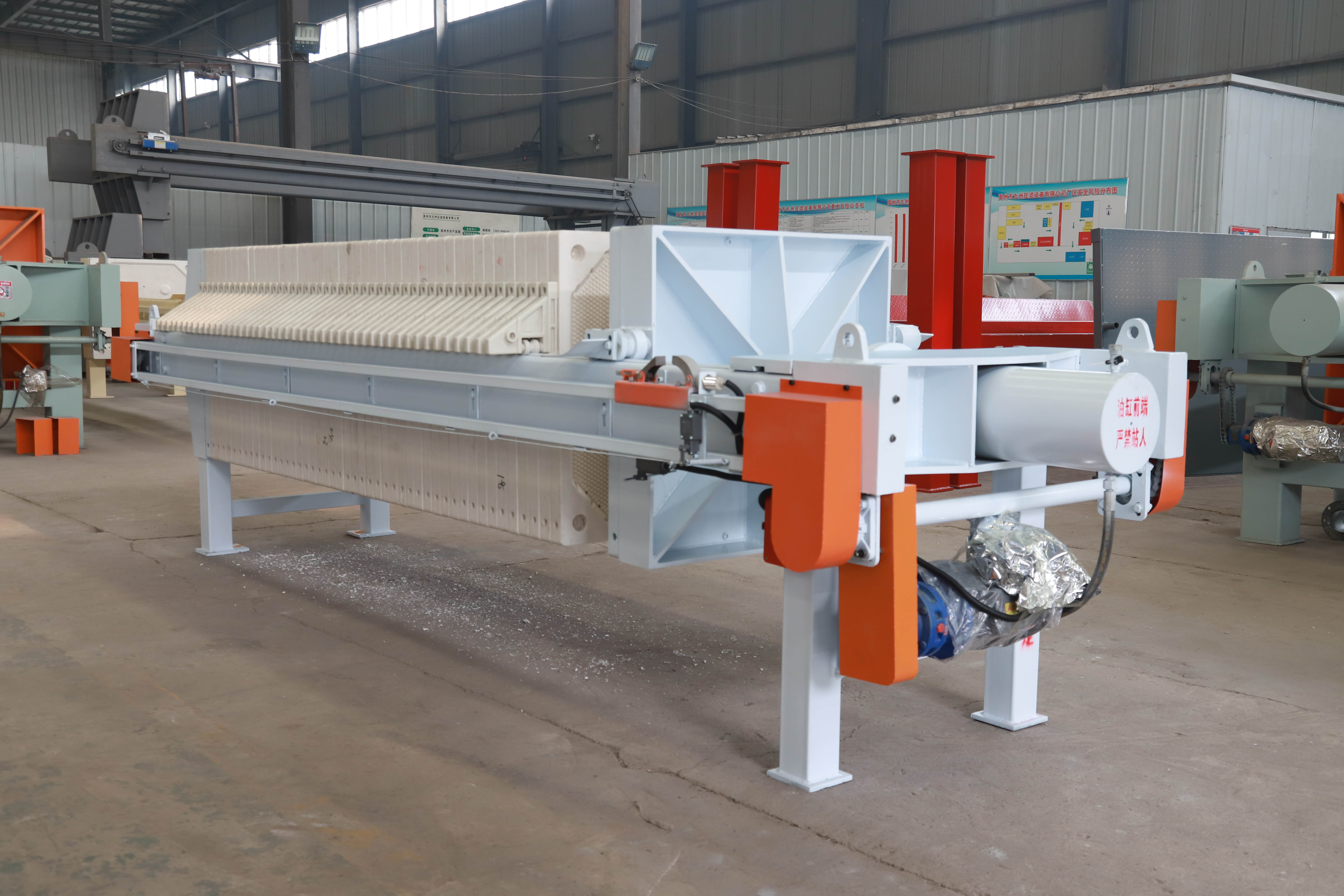 廂式壓濾機(jī)工作原理是由濾板排列組成濾室(濾板兩側(cè)凹進(jìn),每?jī)蓧K濾板組合成一廂形濾室)。